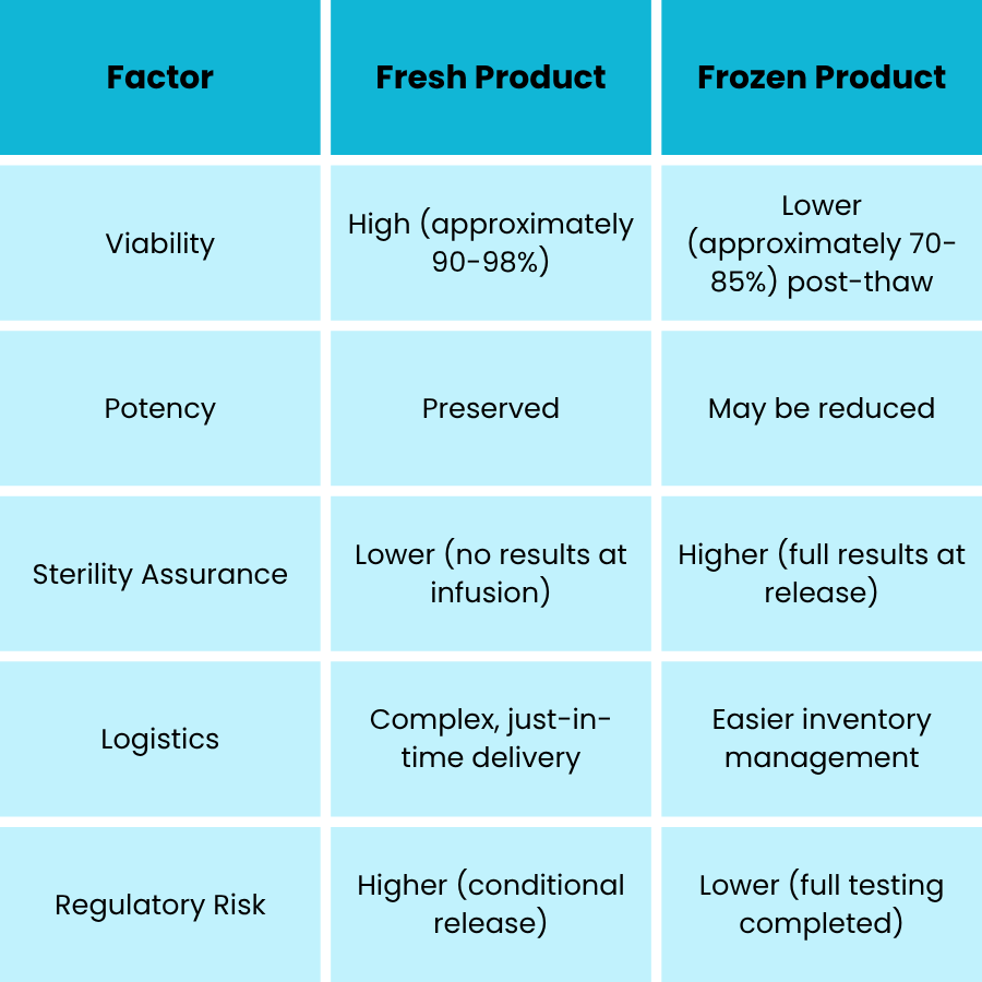 Cryopreservation allows for full release testing but may compromise potency and viability, affecting clinical efficacy.